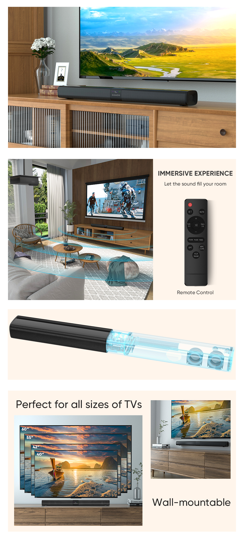 Multiple Connection: The built in Bluetooth 5.0 makes the soundbar easily and quickly connect to streaming media devices such as TVs, mobile phones, and tablets. The TV sound bar also have HDMI-ARC, Optical and AUX inputs ,which gives you more options when connecting with a variety of home theater devices such as TVs, laptops, desktop computers, projectors.