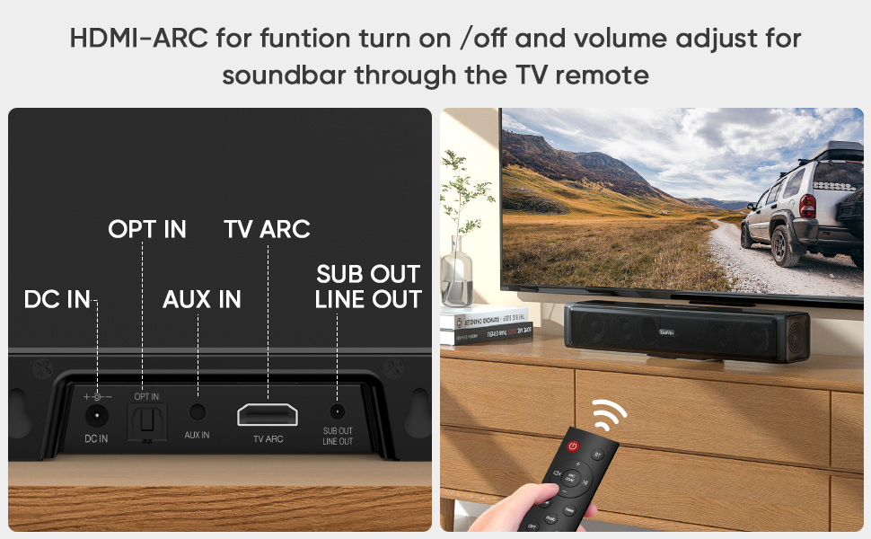 Stream Audio with Bluetooth: Our soundbar allows you to connect your devices seamlessly via Bluetooth, so you can easily stream your favorite music,podcasts, and more from your smartphone, tablet, or other Bluetooth-enabled device. The TV sound bar also offers multiple connectivity options, including HDMI ARC, Optical and AUX, allowing you to connect it to various devices such as TV, Computer, Projector. Note:Plug the HDMI cable(not supplied) into a port on your TV labeled HDMI ARC, not HDMI.