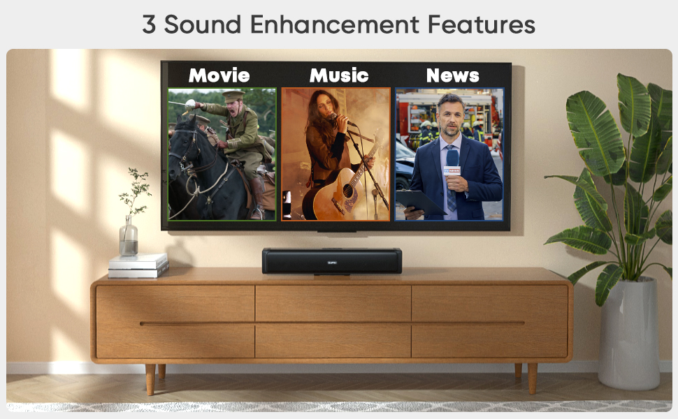 Extremely Stylish Design: This soundbar combines a robust build with a touch of elegance, showcasing a modern design that exudes sophistication. The TV soundbar‘s aesthetic appeal is complemented by its exceptional sound quality, delivering a rich and immersive audio experience. With the stylish design, you can choose to place the soundbar directly on the table, cabinet or mount it on a wall to save your space according to your home decoration style and personal preferences.